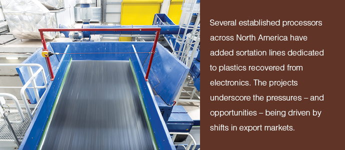 Of late, however, some encouraging North American projects have come on-line, with recycling companies in both the e-scrap and plastics sectors investing and fine-tuning systems built specifically to sort e-plastics. By separating by resin, more downstream options open up, and this in turns allows material to keep moving through the system.