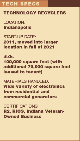 Technology Recyclers recently moved from a 65,000-square-foot facility in Indianapolis to a 170,000-square-foot plant a half mile away. Along with the move, the company is installing new shredding and sorting equipment on its scrap processing line.