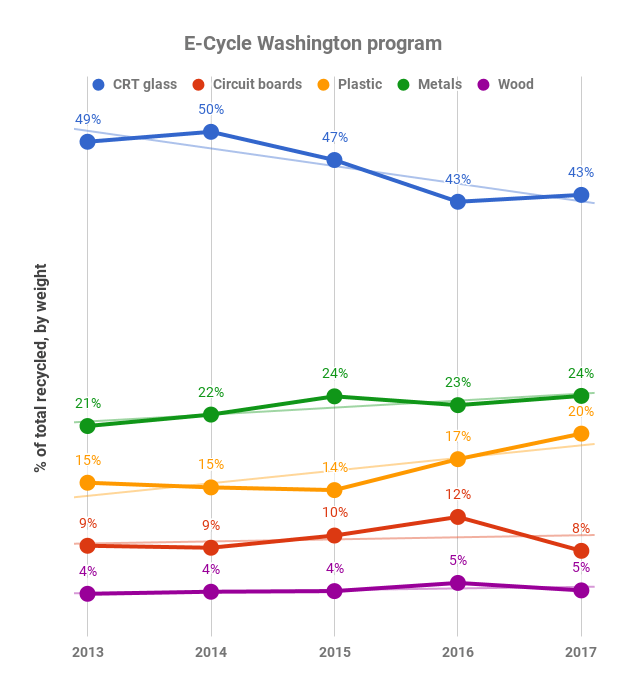 For example, five years ago, CRT glass made up 49 percent of all weight destined for recycling. Last year, it was 43 percent. Five years ago, plastics were 15 percent of the weight, and last year they were 20 percent.
