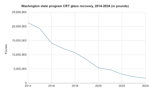 In Connecticut, CRT glass recovery volumes have dropped from 11.6 million pounds in 2014 to 1.46 million pounds in 2024.