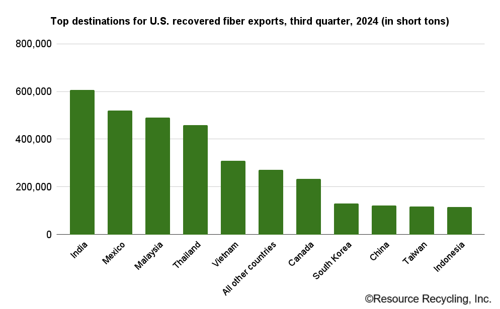 By weight, the largest importers of U.S. scrap plastic were Malaysia (443 million pounds), Canada (294 million), India (294 million), Hong Kong (267 million), Thailand (235 million), Vietnam (165 million), Taiwan (114 million), China (106 million), Mexico (101 million), South Korea (78 million), Indonesia (60 million) and Turkey (52 million).