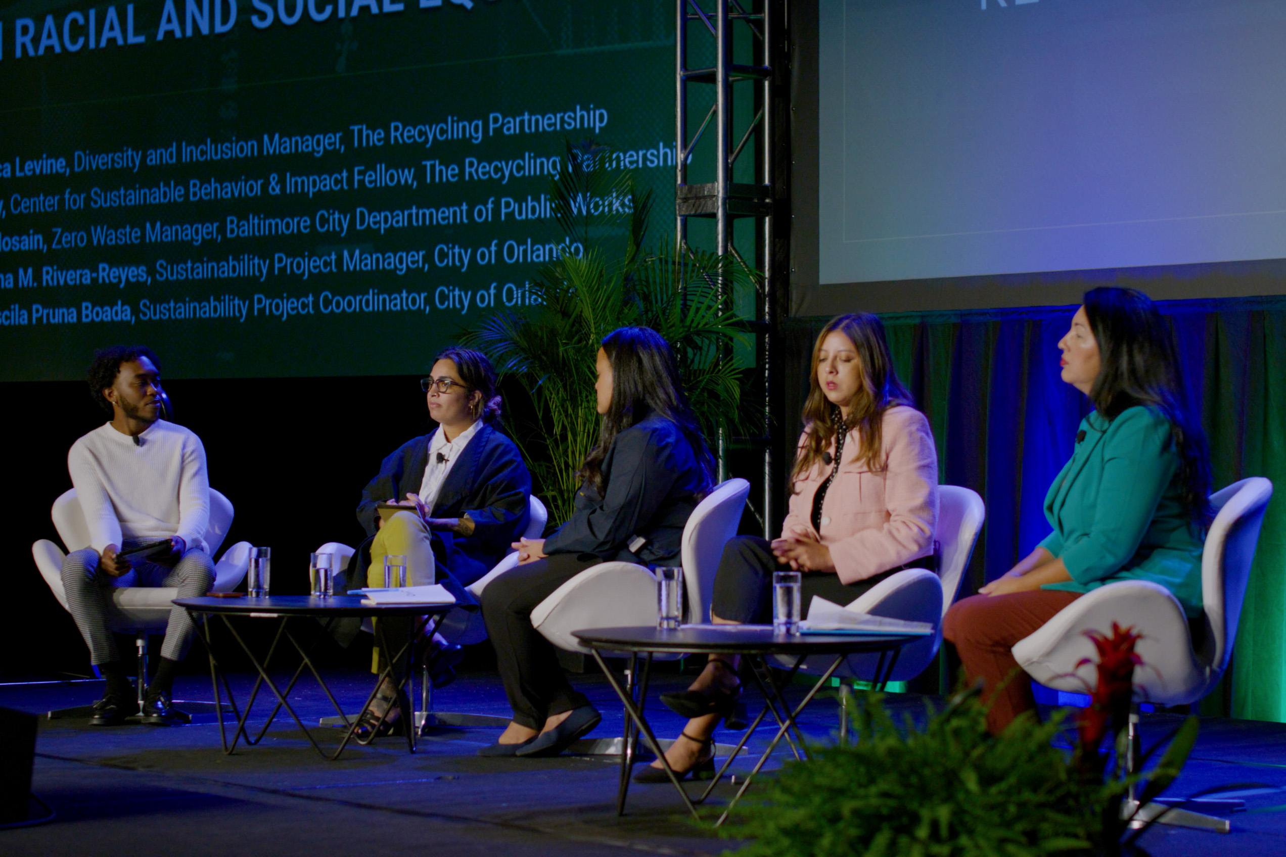 Panelists were Jessica Levine, diversity and inclusion manager at The Recycling Partnership; Sophia Hosain, zero waste manager at Baltimore Public Works; Digna Rivera-Reyes, sustainability project manager for the city of Orlando; and Priscilla Pruna Boada, sustainability project coordinator for the city of Orlando.