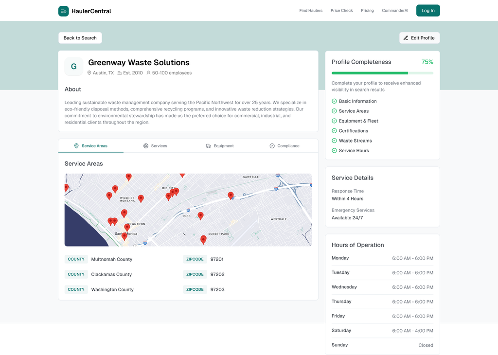 The service offers verified profile ownership with full editing rights, service mapping, granular equipment listings such as front-load or roll-offs, and accepted waste streams, including MSW, recyclables and organics), real-time notifications,