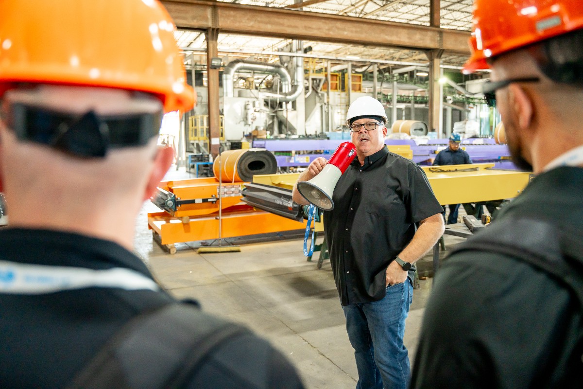 As we made our way into the company’s 500,000-square foot facility, big yellow gantries moved overhead. A faint aroma of cut metal hung in the air. On our first stop, plant tour guide Mike Whitney pointed out the stations where 6,000- and 12,000-watt lasers were used to cut sheet metal. The slabs of steel would soon find their way into parts for conveyor belts and platforms, he explained.