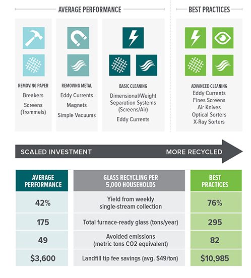 In the graphic below, typical MRF glass processing steps are shown in the “Average Performance” column, and more advanced undertakings are shown to the right. At the bottom, we’ve quantified the benefits of utilizing best practices.