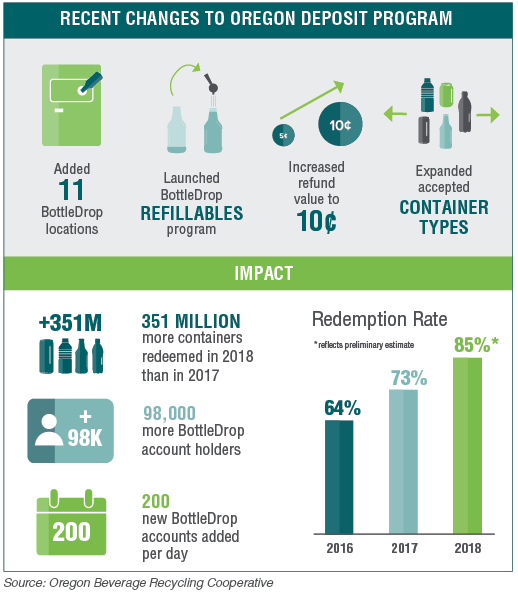 For instance, in recent years, the program expanded its list of covered containers, boosted the redemption value and has seen impressive results (including 85 percent recovery in 2018 for a broad range of covered beverage containers).