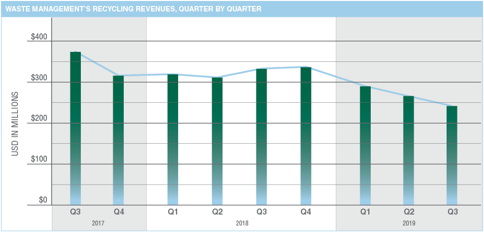 The impact of the seismic shift in recycling markets over the past two-and-a-half years can be clearly seen in the quarterly recycling revenue numbers of Waste Management, which operates roughly 100 materials recovery facilities in North America.