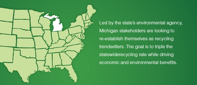 For the past three years, Michigan brought a stakeholder group of more than 70 people together to draft key policy updates related to materials recovery. Goals include creating a planning process for sustainable materials management and recycling; establishing minimum recycling access standards; developing composting regulatory requirements; and formulating other key policy tools.