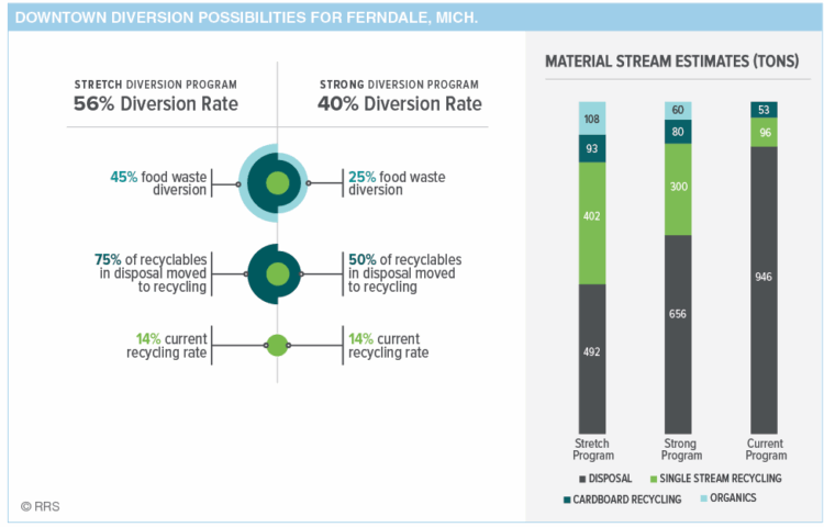 Cities with thriving downtowns face multiple challenges regarding solid waste management, including space constraints, varying frequency of service needs, data inconsistencies, and complications in incorporating recycling collection. Through the development of a waste reduction and recycling master plan, the city of Ferndale, Mich. sought to explore potential opportunities to ensure waste needs are met and diversion programs thrive in its central business district (CBD).