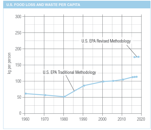 According to the U.S. EPA, 30% to 40% of the food supply in the U.S. is never eaten, an issue the EPA has been trying to address more aggressively of late and the subject of “From Farm to Kitchen: The Environmental Impacts of U.S. Food Waste,” published by the agency late last year. To help bring more awareness to food-recovery gaps, the EPA has also shifted its methodology to measure food loss and waste (FLW). From 1960 through 2017, the agency’s annual “Facts and Figures” dataset included only food from the retail and consumption supply chain stages that was sent to landfills, incinerators and compost facilities. However, more recently, the EPA has also measured tonnages that move to six additional pathways: donation, animal feed, anaerobic digestion/co-digestion, land application, sewer/wastewater, and bio-based materials/biochemical processing. The graph below shows the amount of U.S. FLW per capita since1960. The shorter, higher line correlating with more recent years shows how the number grows by about 50% when those additional FLW pathways are included.
