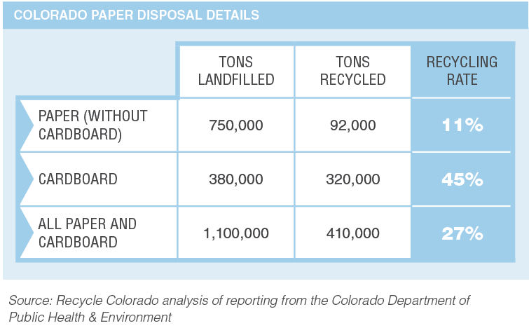 But Recycle Colorado, an organization representing recyclers and others, recently released a report noting that in the Centennial State, the overall paper recycling rate is 27%. That is less than half of the U.S. average. “Through a producer responsibility policy, Colorado can transform its current recycling system from a disjointed, confusing, and inconvenient patchwork of programs into a coordinated, equitable, and cost-effective statewide system,” Recycle Colorado stated in its report.