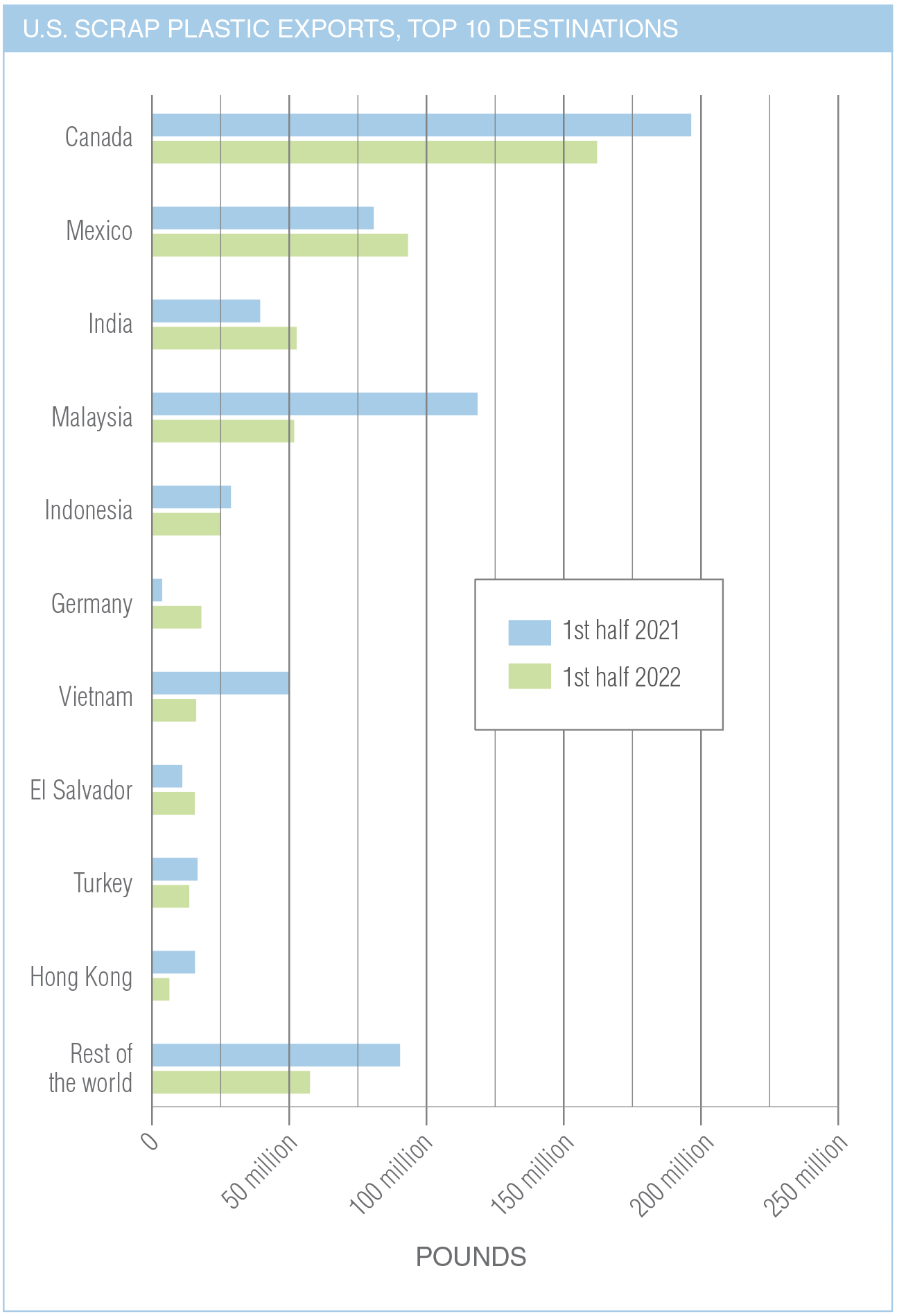 The U.S. continued to ship less scrap plastic overseas during the first half of this year, federal trade data shows. U.S. companies exported 510 million pounds of scrap plastic during the first six months of 2022, down 22% year over year, according to the U.S. Census Bureau. The bureau recently released June numbers, allowing Resource Recycling to compare the first half of 2022 with the first half of 2021. For years, the amount of plastic being exported has been falling, and this year saw that trend continue. The chart below shows the top 10 downstream destinations for U.S. scrap plastics during the first half of the year.
