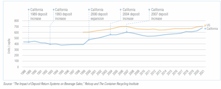 Reloop and CRI both advocate for deposit systems. One of the states analyzed by the researchers was California, which passed its first DRS law in 1986, instituting a refund value of one-tenth of a cent for several types of beverage containers. Over the ensuing years, that value was periodically bumped up, reaching four-tenths of a cent in 2004. And even with the redemption program expanding in 2000 to include almost all containers for non-carbonated beverages, California saw its per-capita packaged beverage sales grow steadily (see chart below).