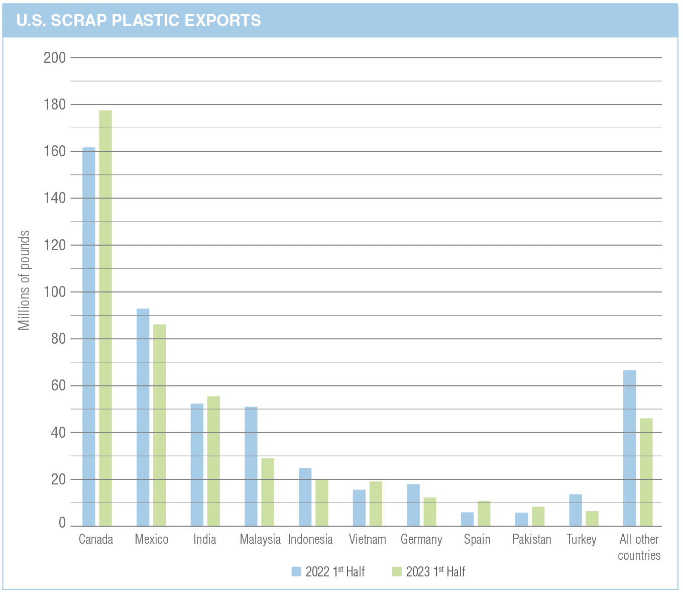 The U.S. exported 474 million pounds of scrap plastic during the first half of 2023, down 7% year over year. The top 10 destinations experienced some notable swings in the amount of material they took from the U.S. For example, shipments to Malaysia dropped 43%, but Vietnam boosted its consumption by 25%. During the first quarter of 2023, plastic exports dropped by 10% year over year.
