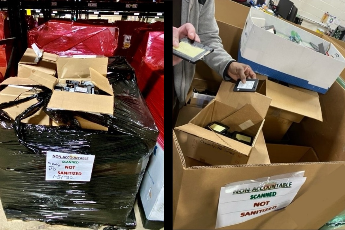Another concern was insufficient internal physical security at the asset management facility. Auditors arrived in a 2023 site visit to find an “open pallet-sized box of extracted electronic storage media, specifically hard drives and solid-state drives,” including “electronic media without any marking or label, as well as media marked unclassified and secret.” A staff member told auditors the open box was unsecured for days or even weeks.