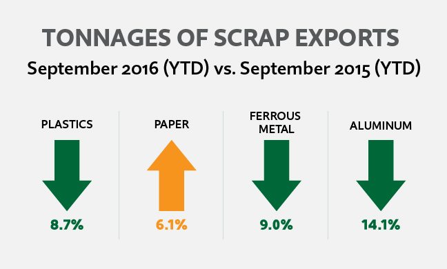 However, when matched against September 2015 levels, the volume of plastic scrap exports in the month was up by 8.5 percent, marking the second straight month of year-over-year gains.