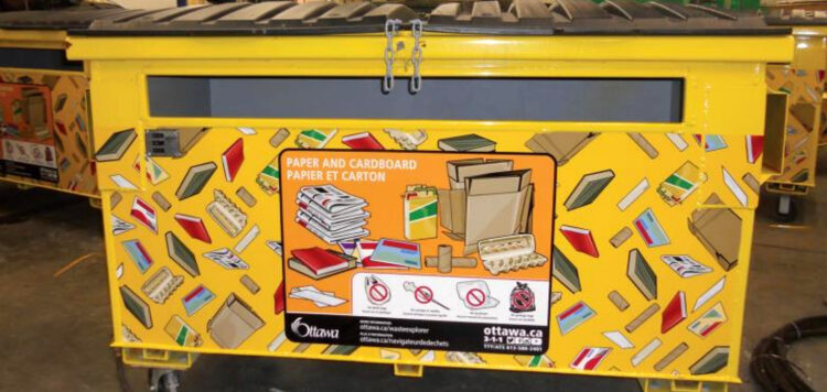 The pilot project was conducted by the city of Ottawa at a multi-family public housing development in the city. Ottawa, population 935,000, has a dual-stream system with separate fiber and container collections. The project’s goal was to determine whether affixing colorful vinyl wraps with pictures of recyclables to front-end-loader bins would help residents get the right recyclables into the right bins.