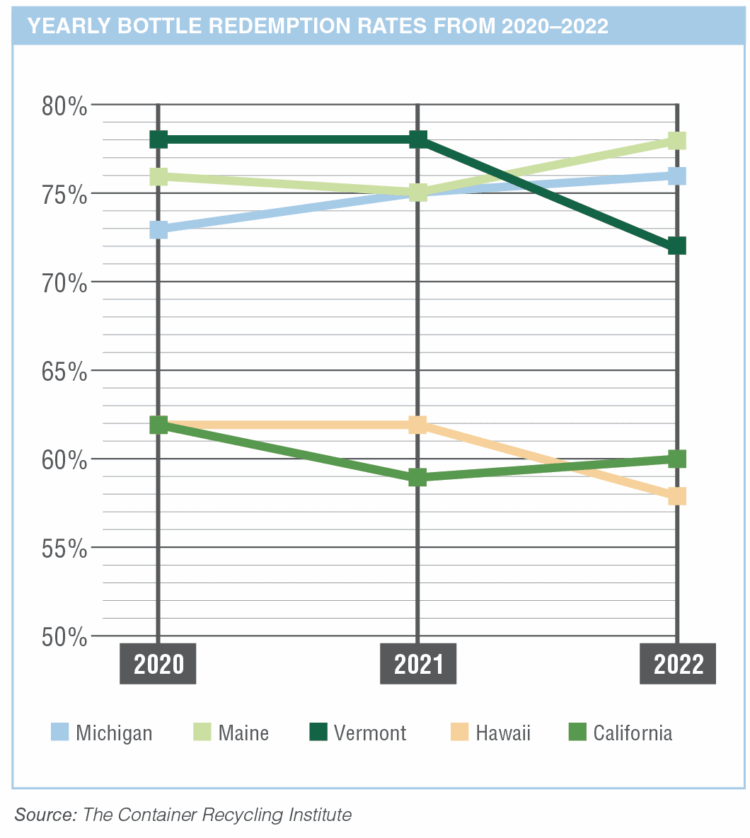 Most states with deposit return systems saw static or reduced bottle redemption rates in 2022, according to new data from the Container Recycling Institute (CRI). The research showed that 2022 beverage container redemption rates in seven of the nine U.S. states with available data on their bottle bills were either lower than or remained within 1 percentage point of their 2021 rates.