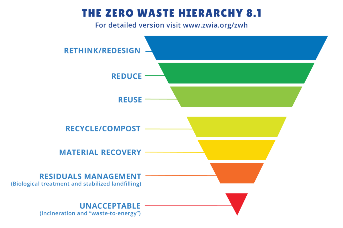 Recently updated as Version 8.1, the Zero Waste Hierarchy offers a comprehensive framework for managing all discarded materials, in a way that aligns with the latest environmental, economic, and health priorities. It places emphasis on rethinking, redesigning, and reducing waste upstream, and provides detailed guidance on acceptable and unacceptable practices throughout the lifecycle of materials.