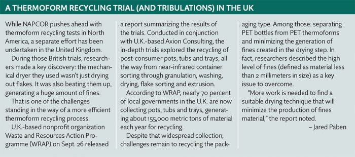 “Through NAPCOR’s early work, we knew that PET thermoforms could be effectively collected, sorted and marketed,” said Dan Kuehn, general counsel for Cross Plains, Wisc.-based thermoform manufacturer Plastic Ingenuity and chair of NAPCOR’s Thermoform Committee. “Even though reclaimers were becoming more comfortable with buying PET bottle bales that contain some PET thermoforms, there were clearly key questions that were holding back the broad acceptance of PET thermoforms in the recycling stream, so we set out to answer those.”