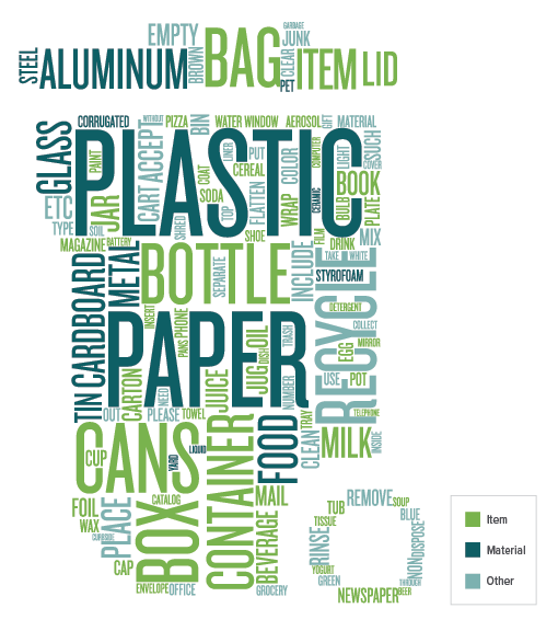 The word cloud below represents the language utilized in 1,000 residential recycling program guidelines, as reviewed by RRS.