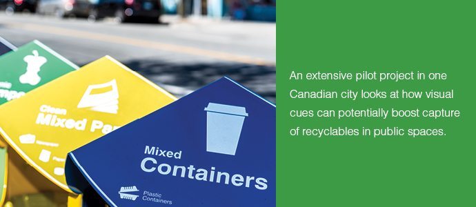 The public-space initiative brought collection stations into a busy section of Vancouver, and it sought to leverage colors and other design elements that residents were already familiar with. Pilot project researchers then used waste composition audits and observation of behavior to determine in what ways the specially designed stations were leading to correct recycling action as well as identify where there remains room for improvement.