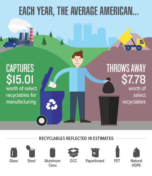 RRS analyzed U.S. pricing averages from recyclingmarkets.net, annual U.S. recycling and landfilling tonnages from the 2014 EPA Sustainable Materials Management report, and U.S. census data to calculate the total per capita value of several commonly recycled packaging types.