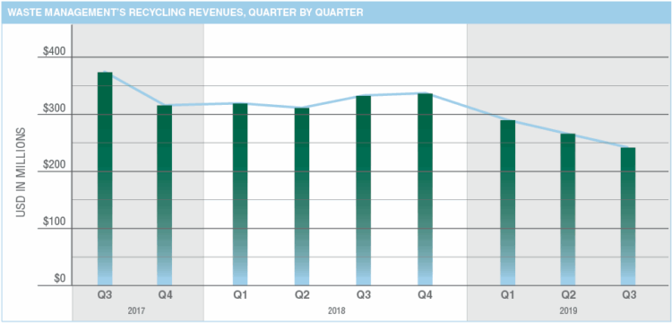 The publicly traded company has seen its quarterly recycling-related revenue decline 35% (from $375 million to $245 million) since the third quarter of 2017. In July of 2017, China announced its intention to ban many categories of recyclables, and the policy was implemented at the start of 2018.