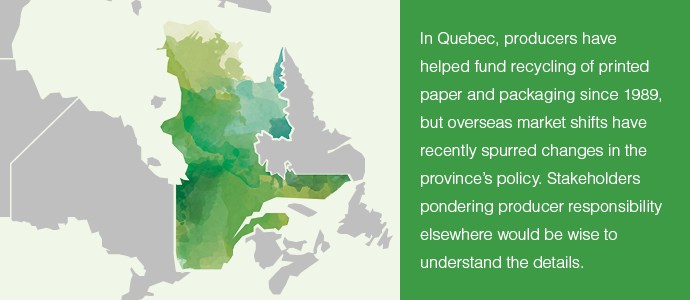 And the program in Quebec is a particularly interesting case study. It’s a framework that has existed in one form or another for the past 30 years, and it has required producers to focus mainly on covering the cost of materials collection and sorting.