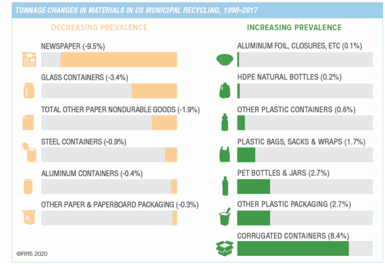 Consumer-product packaging has evolved significantly over the past 25 years, challenging curbside recycling systems. In November 2019, the U.S. EPA released the annual national waste report, “Advancing Sustainable Materials Management: Facts and Figures.” RRS regularly analyzes data from this major source, as well as others, to track key trends by packaging category.