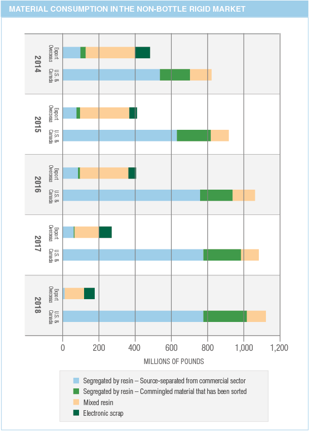 Recently released industry data indicates that at least 1.3 billion pounds of post-consumer non-bottle rigid plastic were recovered for recycling in 2018, and as in previous years, the majority of non-bottle rigid plastic was purchased by U.S. and Canadian reclaimers.