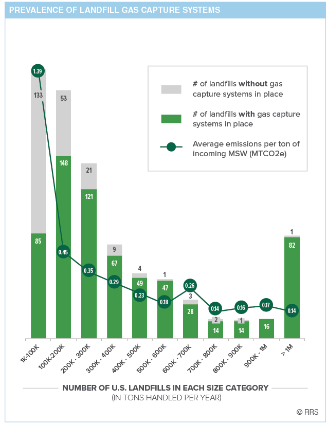 The graphic breaks out active U.S. landfills into size tiers based on annual incoming MSW quantities, differentiating those with and without gas recovery systems. The graphic overlays the average emissions per ton of incoming waste for each size tier. The 221 smallest landfills (those receiving between 1,000 and 100,000 tons of MSW per year) averaged reported emissions of 1.39 metric tons of CO2 equivalent per ton of waste received.