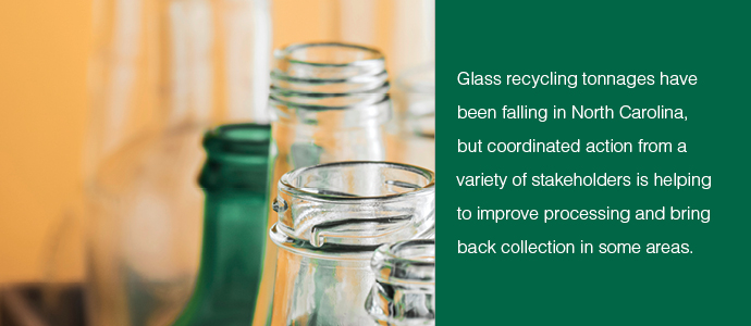 In North Carolina, the collection of glass for recycling has fallen by 30% in the past four years, a decline fueled in part by global commodities market shifts and the COVID-19 pandemic. To help meet the glass industry’s aggressive goals and align with economically beneficial end markets, North Carolina community recycling programs need to reverse the declining glass recovery trend across the state.