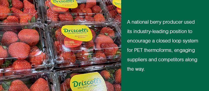 In 2020, Watsonville, Calif.-based Driscoll’s challenged its clamshell suppliers to boost their average percentage of RPET derived from thermoforms from 0% to 10% by the end of the year. They succeeded, with some reaching 25%.